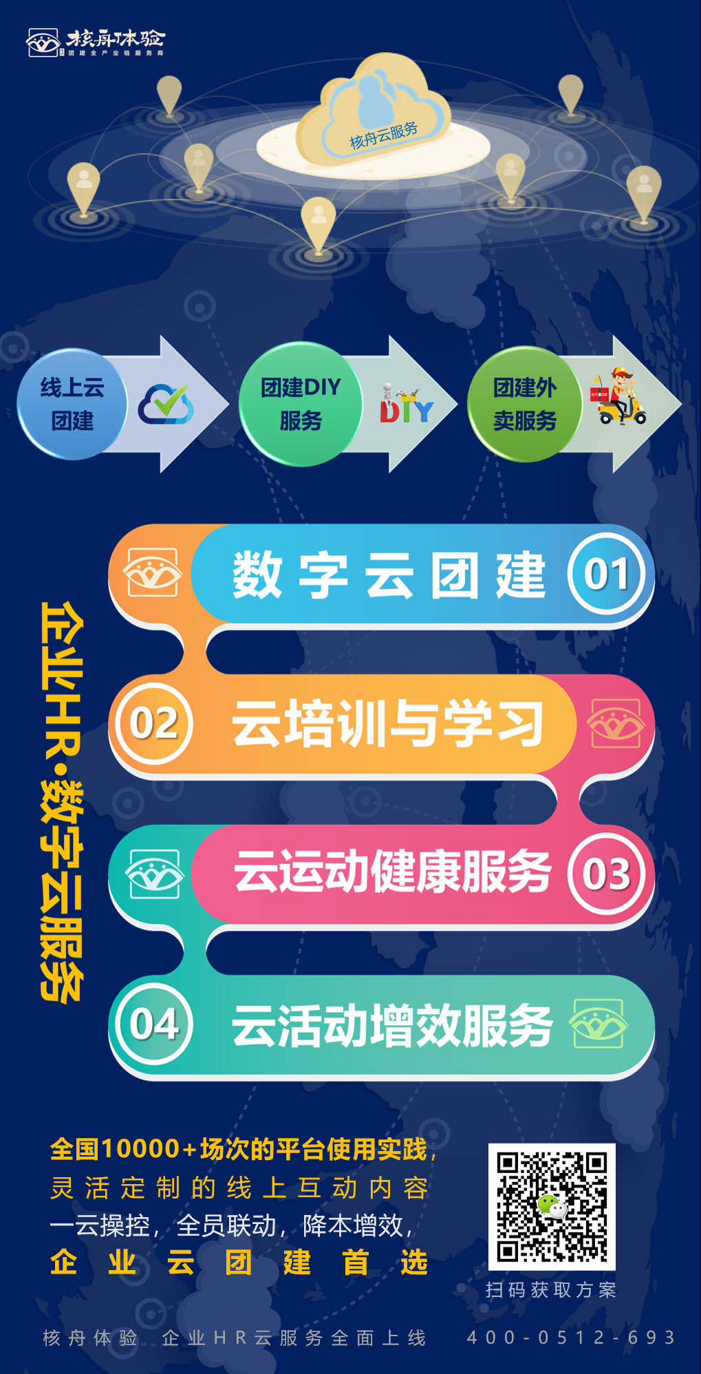 企業(yè)HR·數(shù)字云服務(wù)包括四大版塊:數(shù)字云團(tuán)建、云培訓(xùn)與學(xué)習(xí)、云運(yùn)動(dòng)與健康服務(wù)、云活動(dòng)增效服務(wù)。